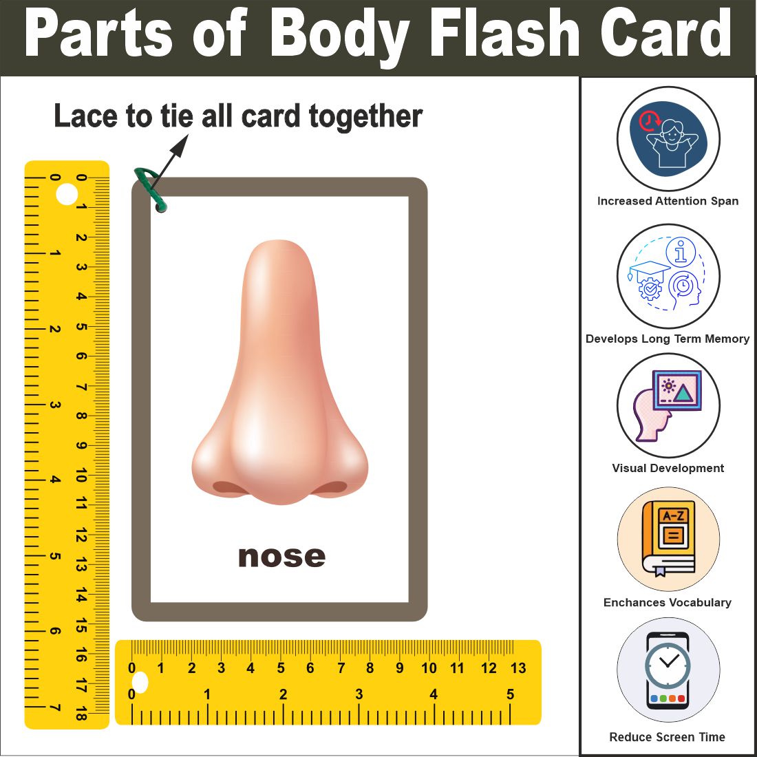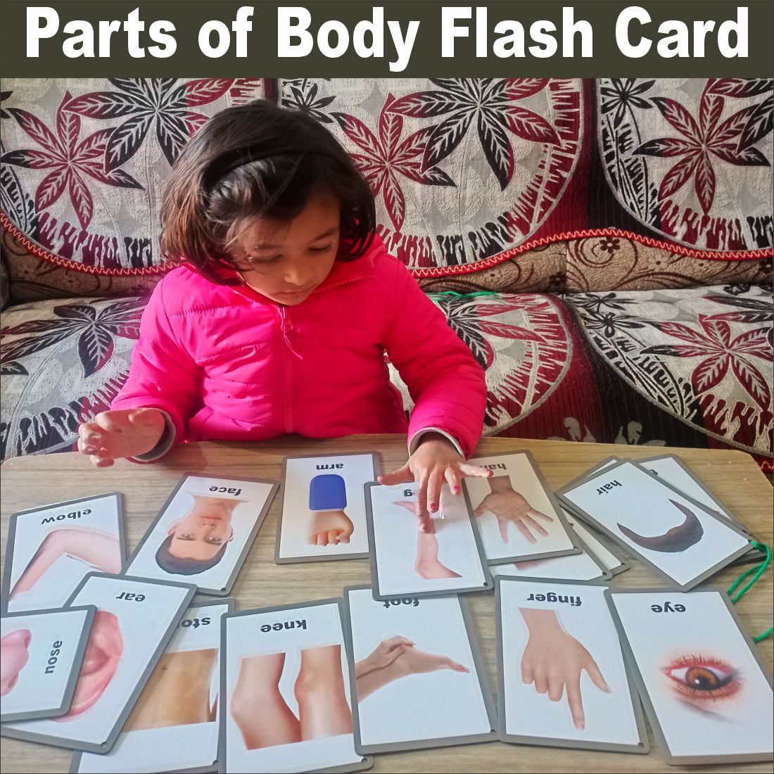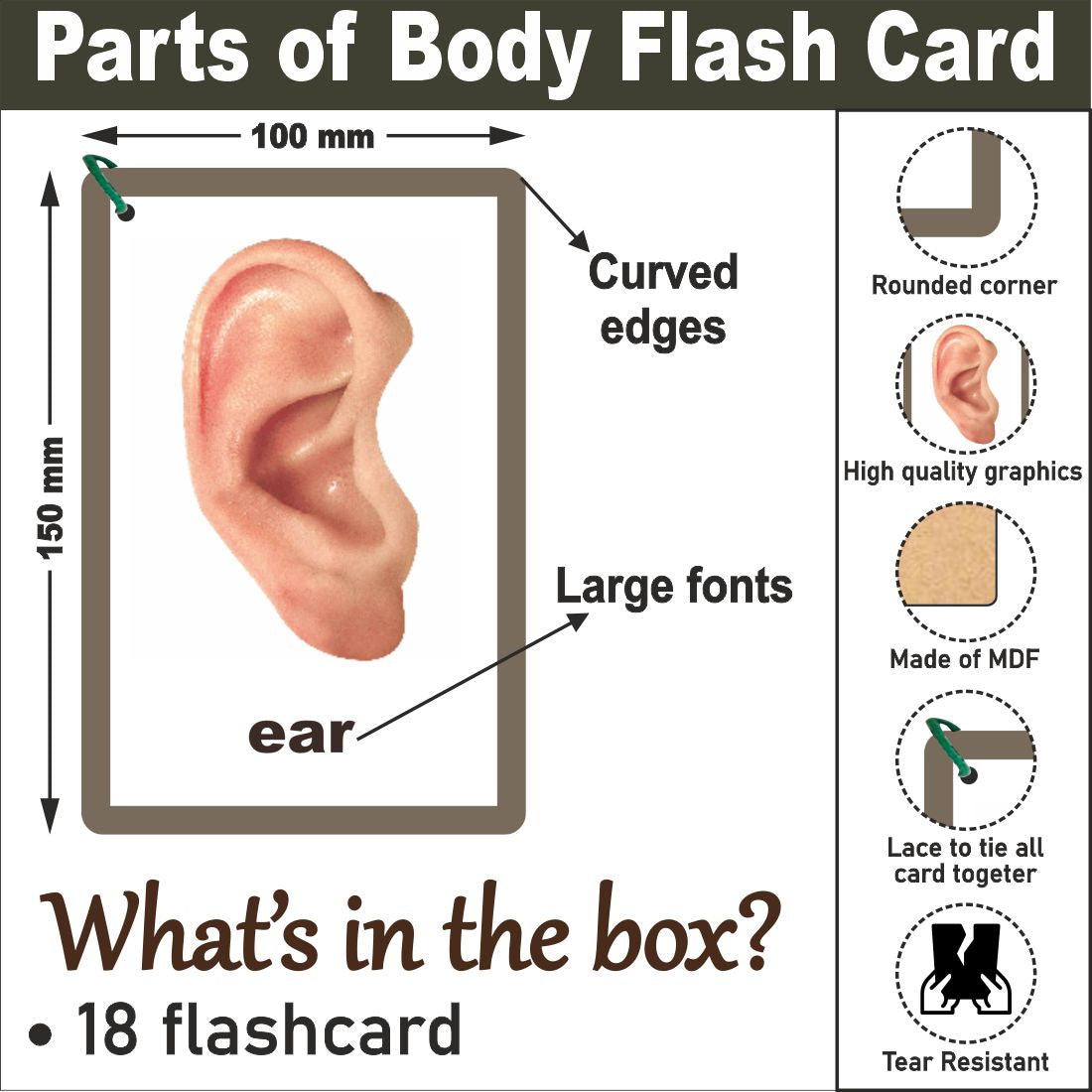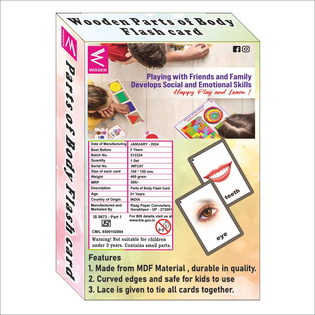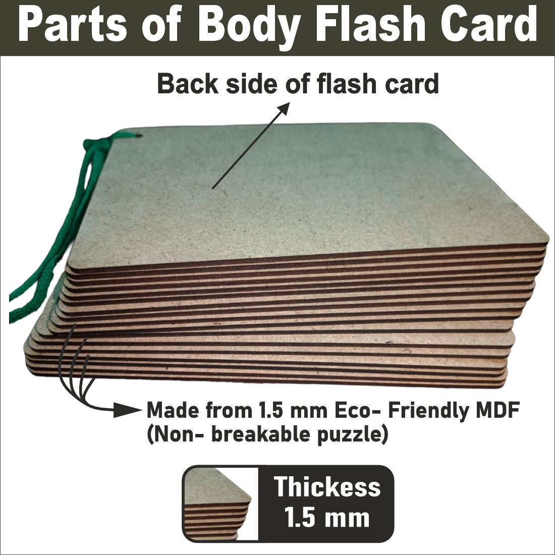 Wooden MDF set of 18 flash cards for kids to learn about Parts of Body. A fantastic way to boost Child's development, help them learn , recognize , increase knowledge and improve active recall among young kids. A fun way to interact and learn for kids. Lace threads given with flash cards helps kids perform different activities like setting up flash card in series as asked. It helps kids not to lose any flash card. It helps them develop hand eye coordination and motor skills too.